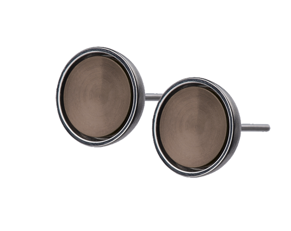 Elegante Ohrringe mit schlichten Edelstahl Halbkugeln und eingefassten, altbronzenen Scheiben.