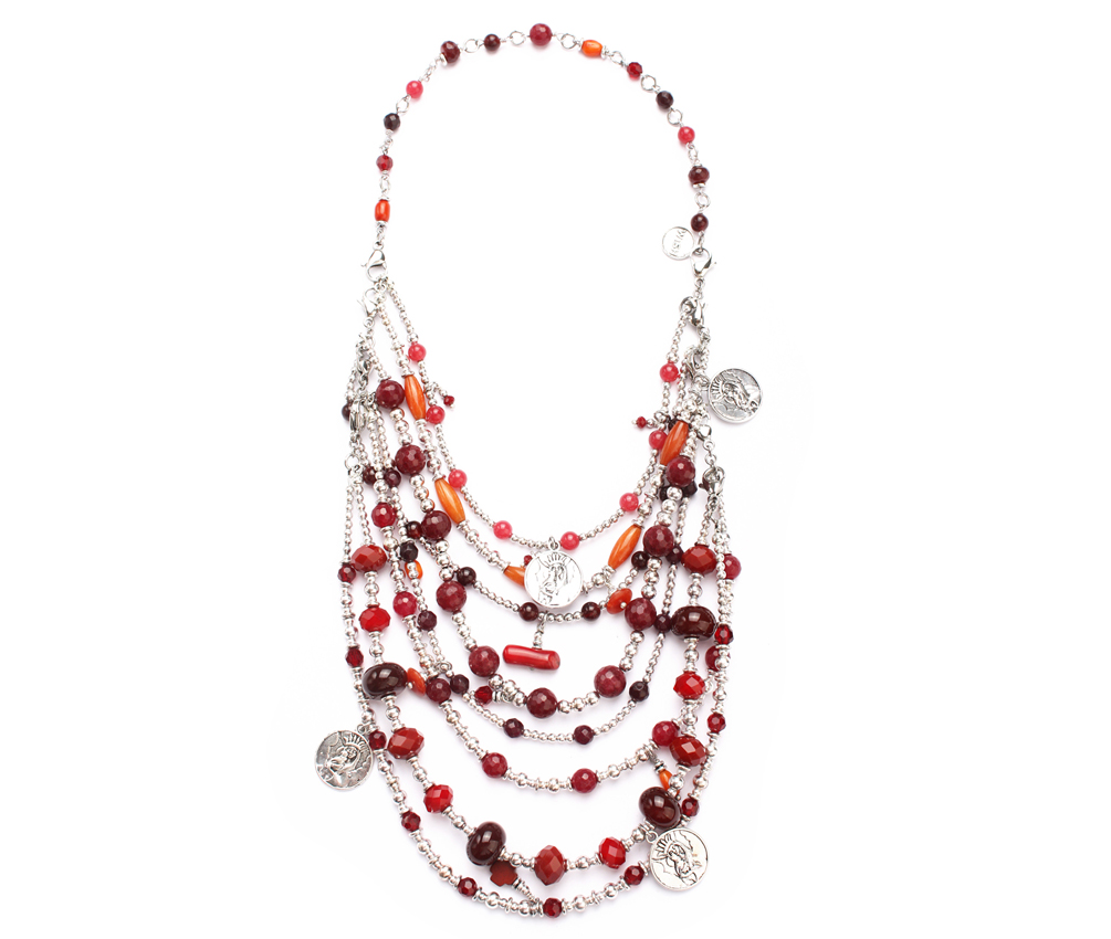 - Aus Achat, Perlmutt, gefärbtem Naturstein, Glas, Jaspis und versilbertem, nickelfreiem Messing.