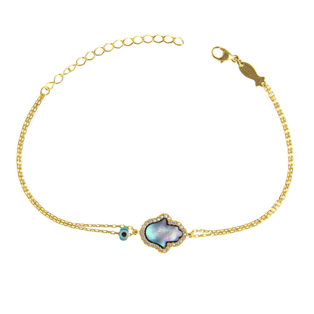 Verzauberndes Kurshuni Armband mit Hand der Fatima aus Perlmutt, vergoldetem Sterling Silber und leuchtenden Zirkonias!