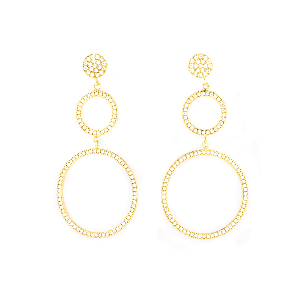 Faszinierende, lange Kurshuni Ohrstecker mit Kreisen aus vergoldetem Sterling Silber, besetzt mit funkelnden Zirkonias!