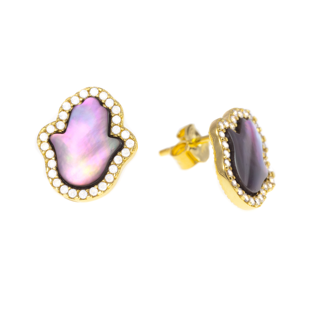 Verzaubernde Kurshuni Ohrstecker mit Hand der Fatima aus Perlmutt, vergoldetem Sterling Silber und leuchtenden Zirkonias!