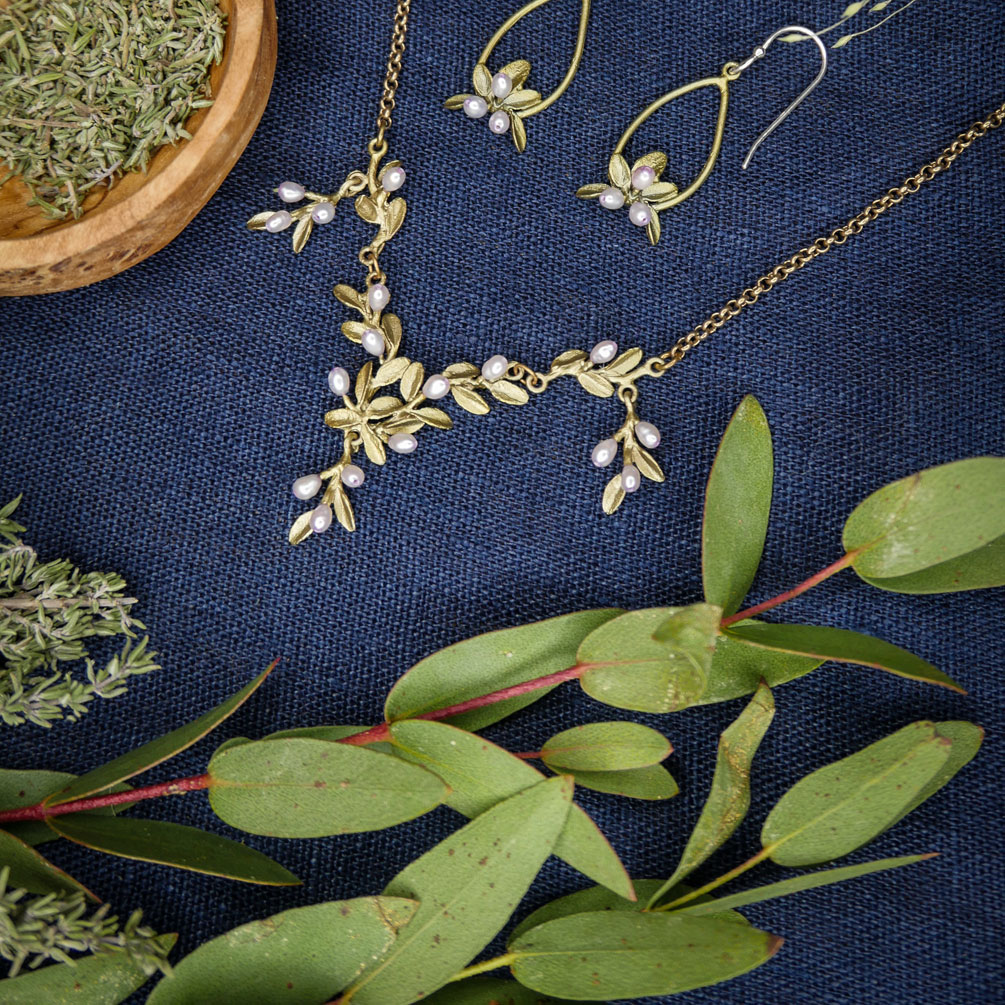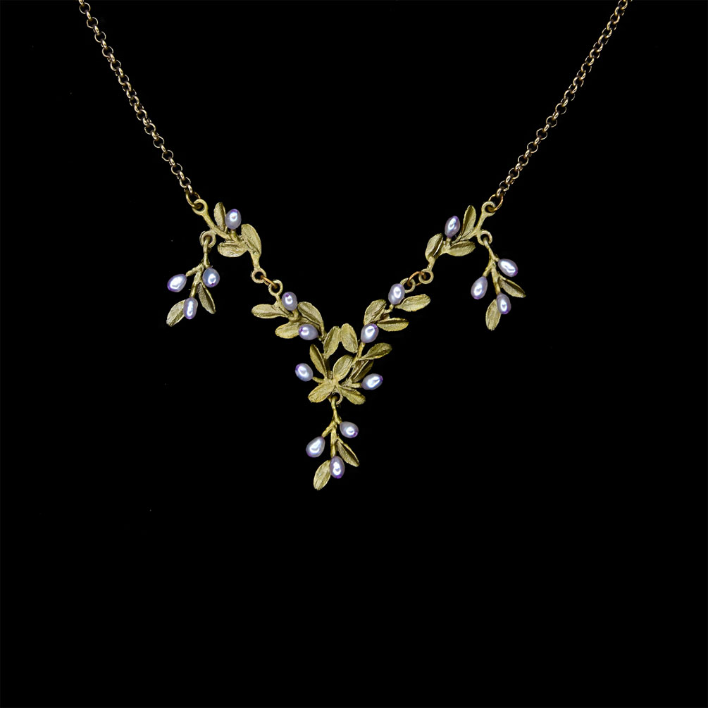 Diese edle Halskette von Michael Michaud hat zarte, wilde Thymian-Blüten aus schimmernden Perlen und feine Blätter aus handpatinierter Bronze!