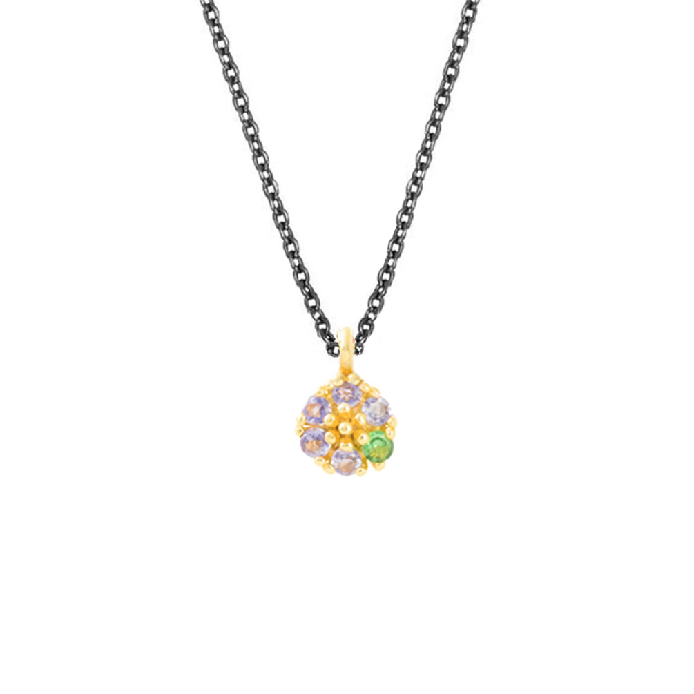 Diese entzückende, goldene Halskette von Krinaki Jewelry trägt eine hinreißende Blüte aus fünf funkelnden, blauen Iolithen und einem grünen Tsavorit!
