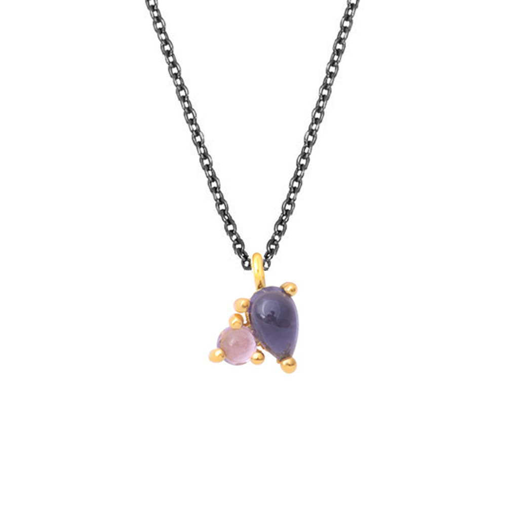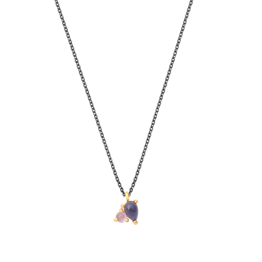 Diese fantastische, schwarze Halskette von Krinaki Jewelry trägt einen Tropfen aus dunkelblauem Iolith und einen pinkem Turmalin in Rundschliff, gefasst in 14 Karat Gold!