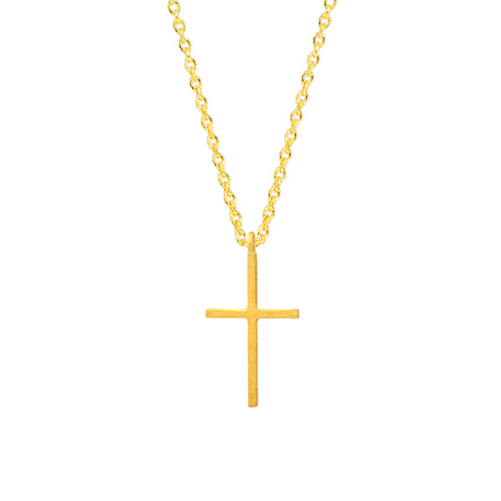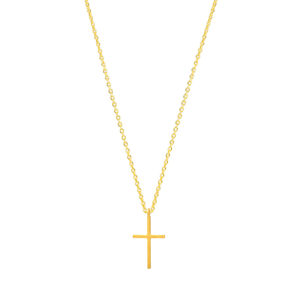 Diese schlichte, goldene Halskette trägt einen feines, elegantes Kreuz von Krinaki Jewelry aus 14 Karat Gold!