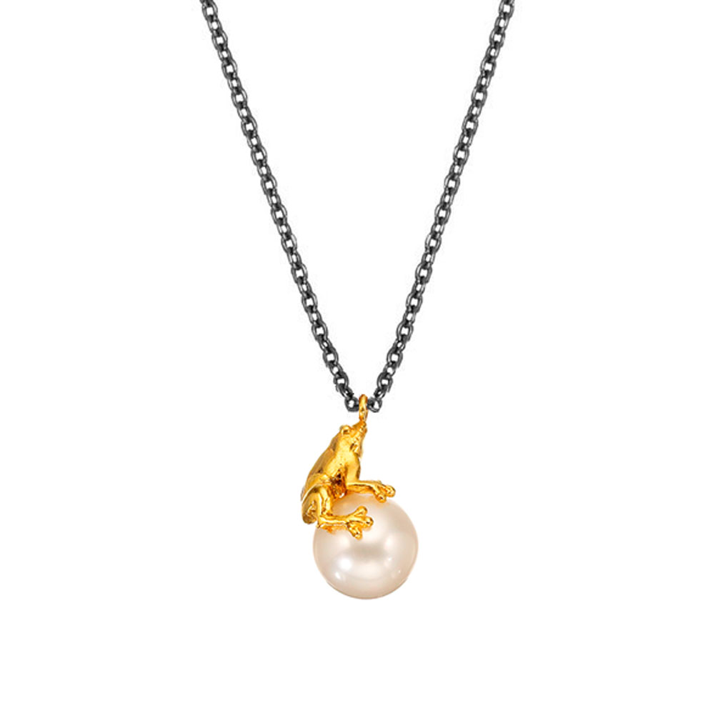 Wundervolle Halskette von Krinaki Jewelry aus Schwarzem Silber mit märchenhaft-schönem, auf einer Perle sitzendem Frosch aus Gold!