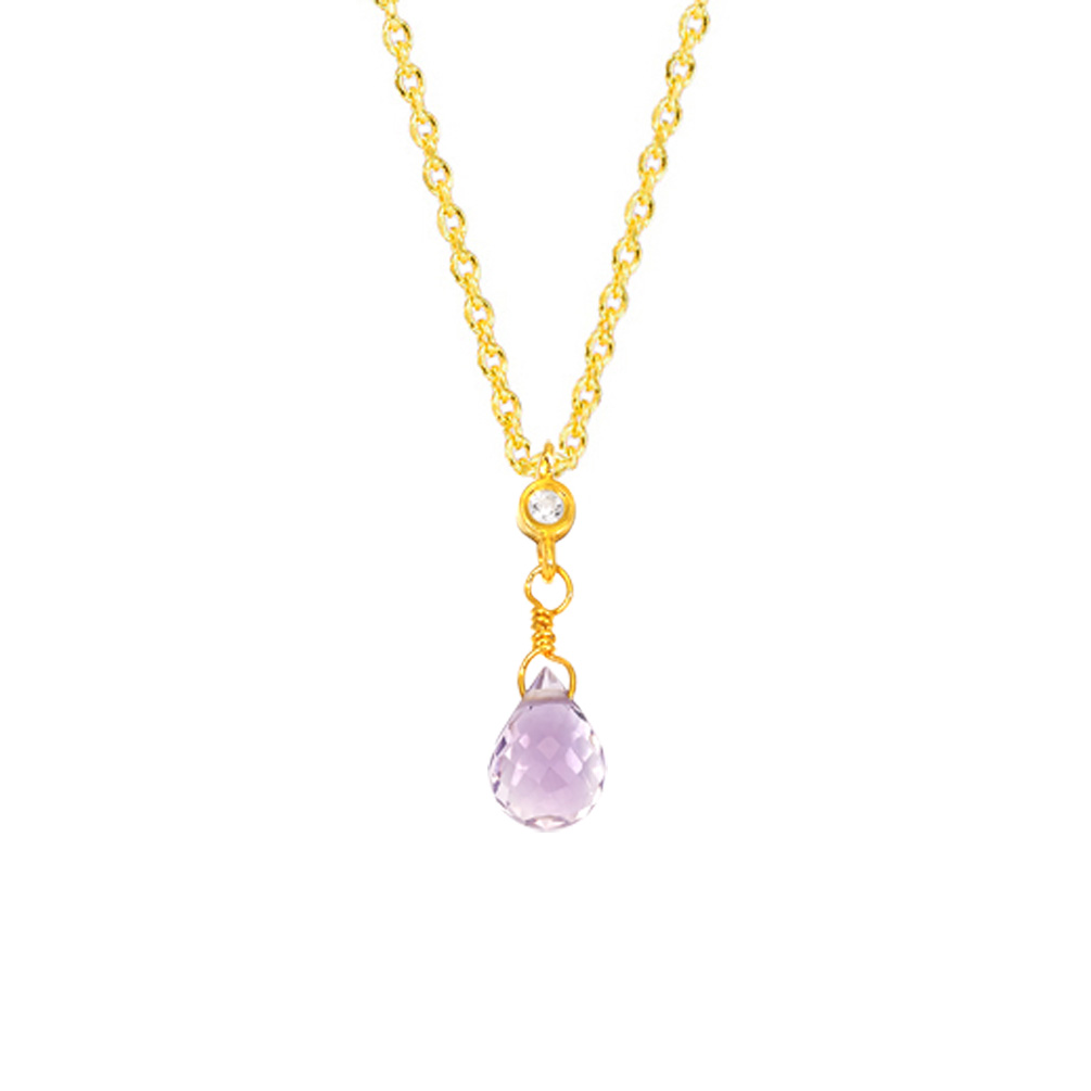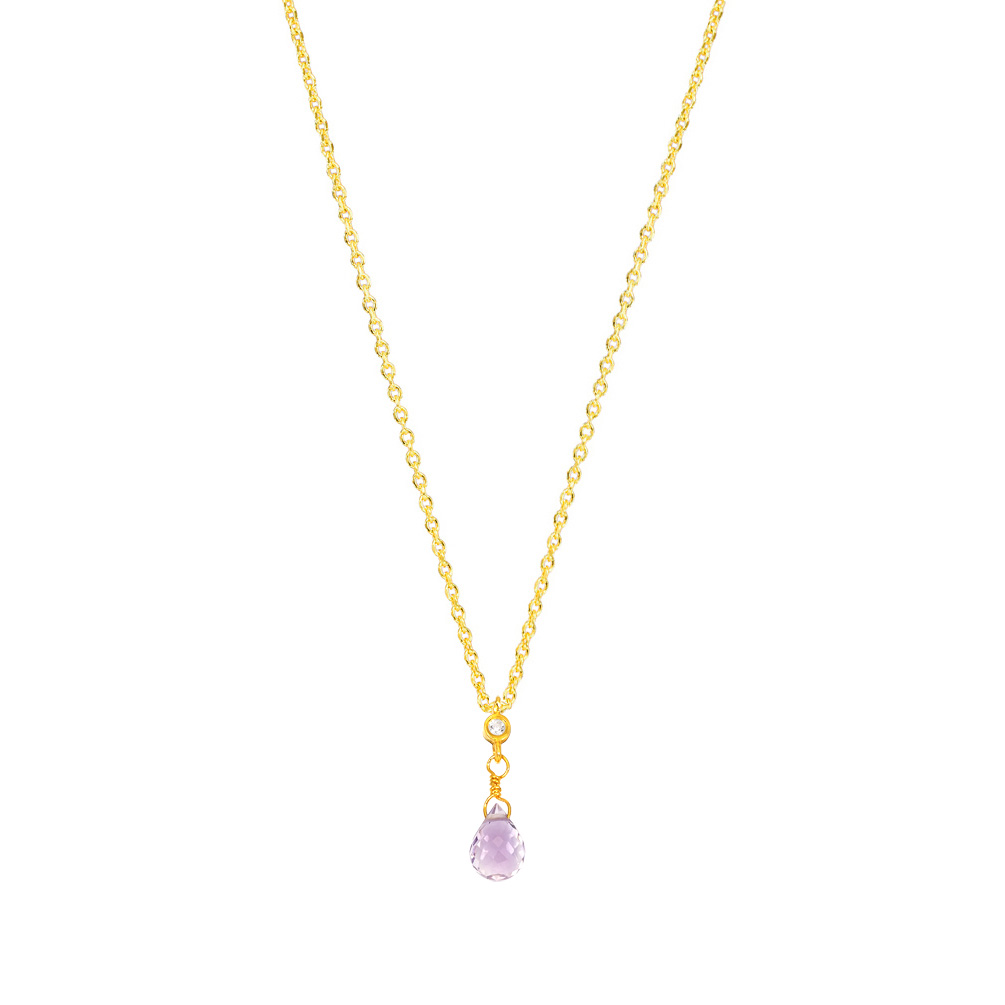 Verspielte, goldene Halskette von Krinaki Jewelry mit violett-funkelndem Tropfen aus facettiertem Amethyst und kleinem Zirkonia!