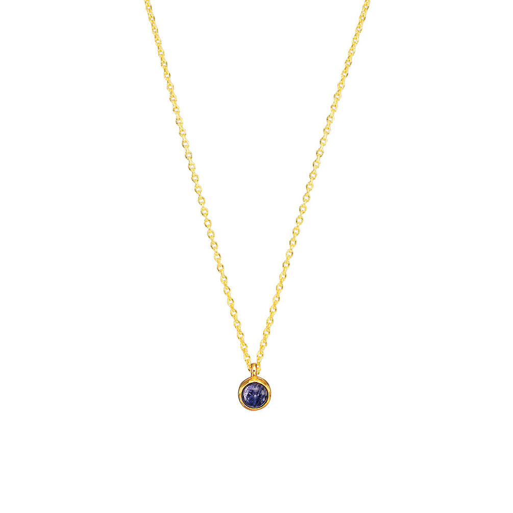 Wunderschöne, elegante Halskette von Krinaki Jewelry mit rundem, schlichtem Anhänger aus blauem Iolith in goldener Fassung!