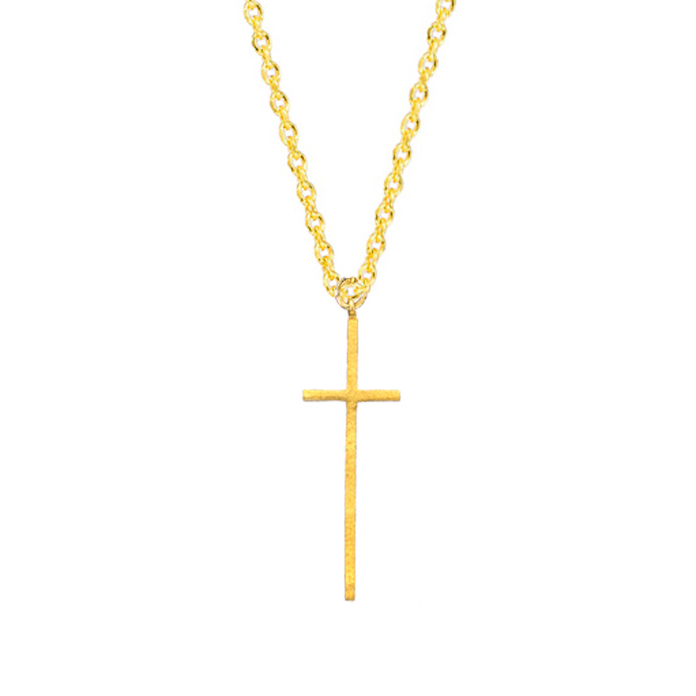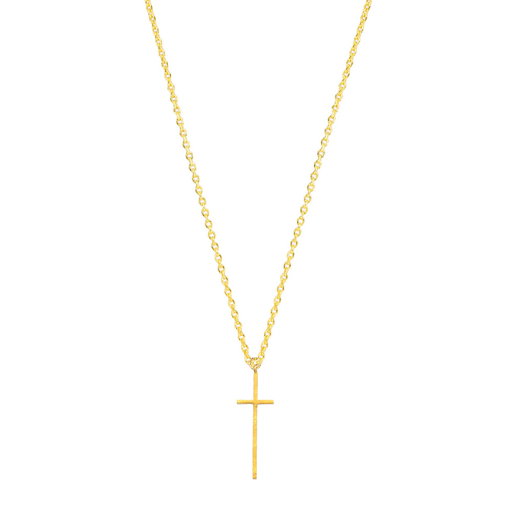 Diese filigrane Halskette von Krinaki Jewelry trägt einen stilvollen, langen Kreuz-Anhänger aus 14 Karat Gold!