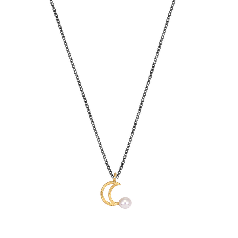 Traumhafte, nächtlich-schwarze Halskette von Krinaki Jewelry mit leuchtendem, goldenen Mondanhänger und bezaubernder Perle!