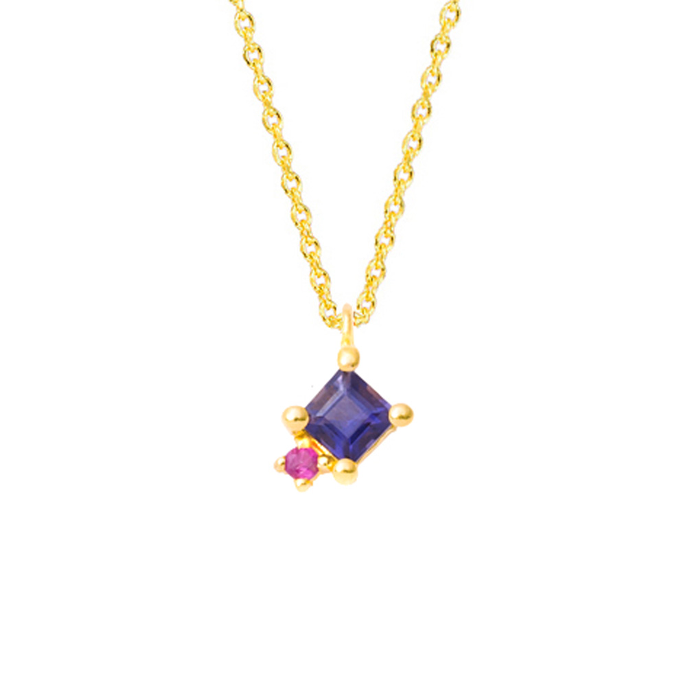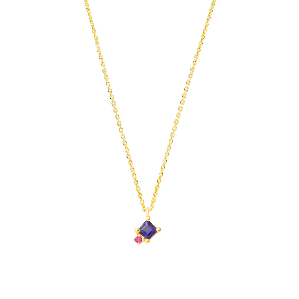 Die stilvolle Halskette von Krinaki Jewelry kombinert zwei leuchtende Quadrate aus blauem Iolith und rotem Rubin als Anhänger!