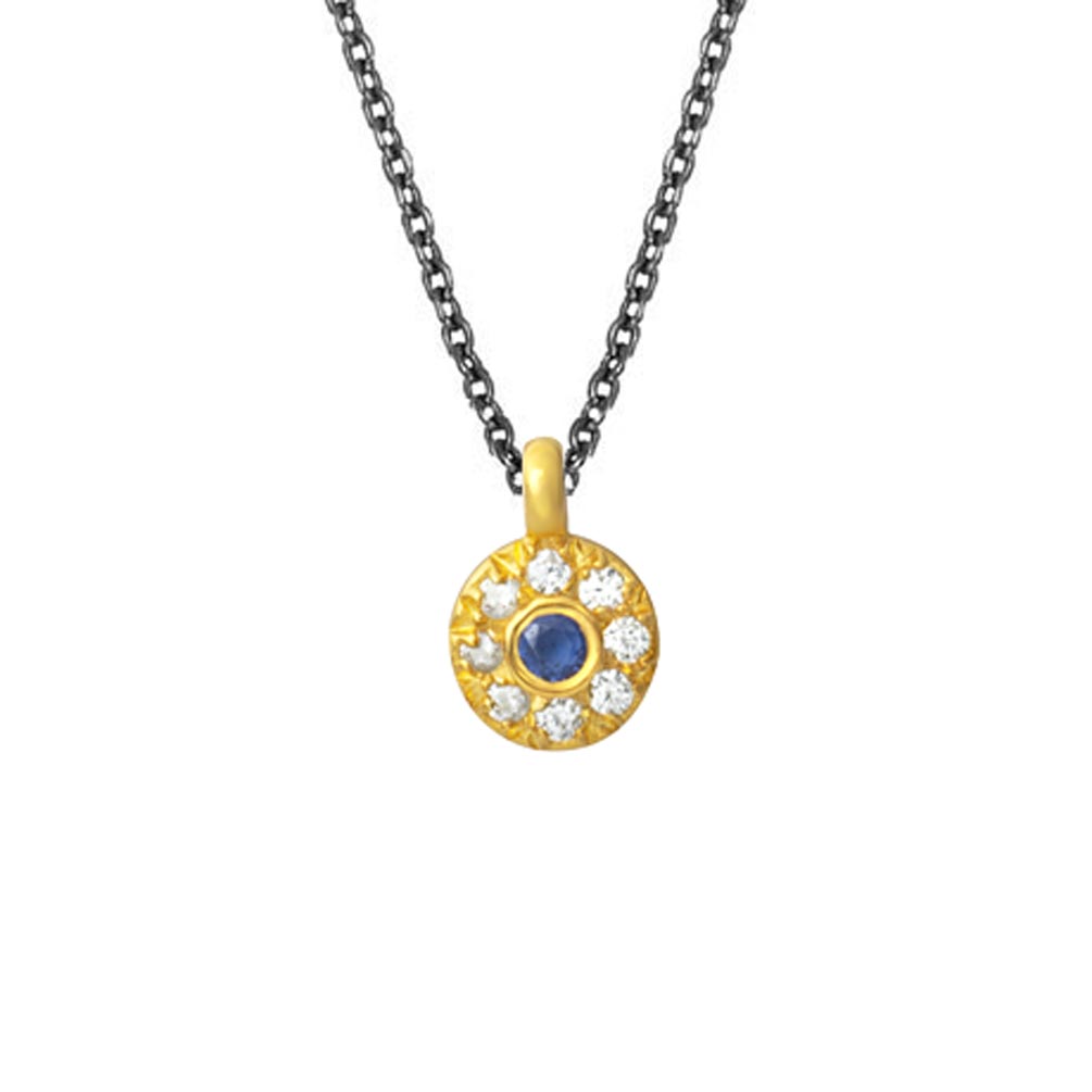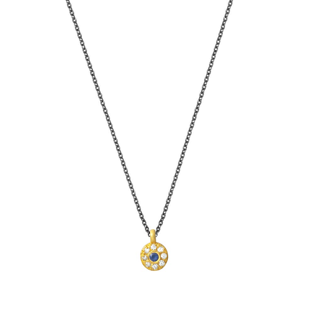 An dieser eleganten, edlen Halskette von Krinaki Jewelry hängt ein runder Anhänger mit leuchtendem Saphir umgeben von funkelnden Zirkonias!