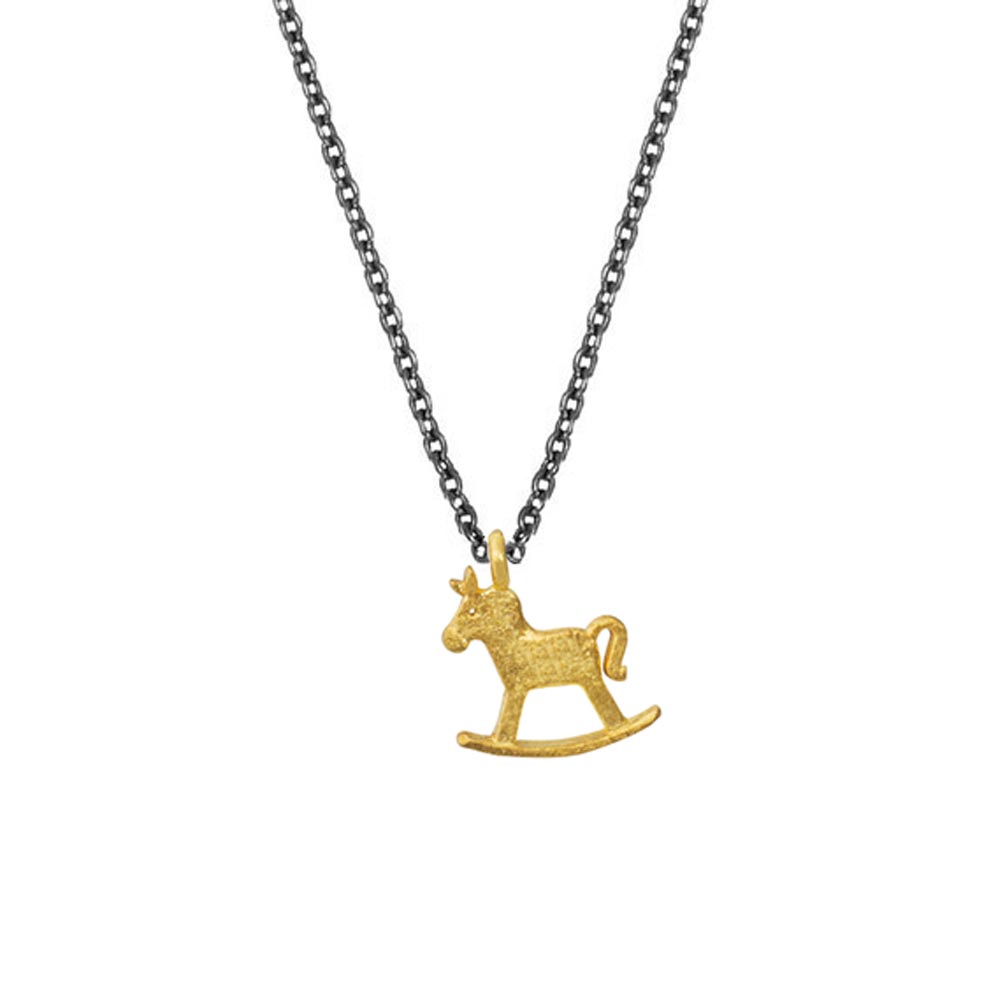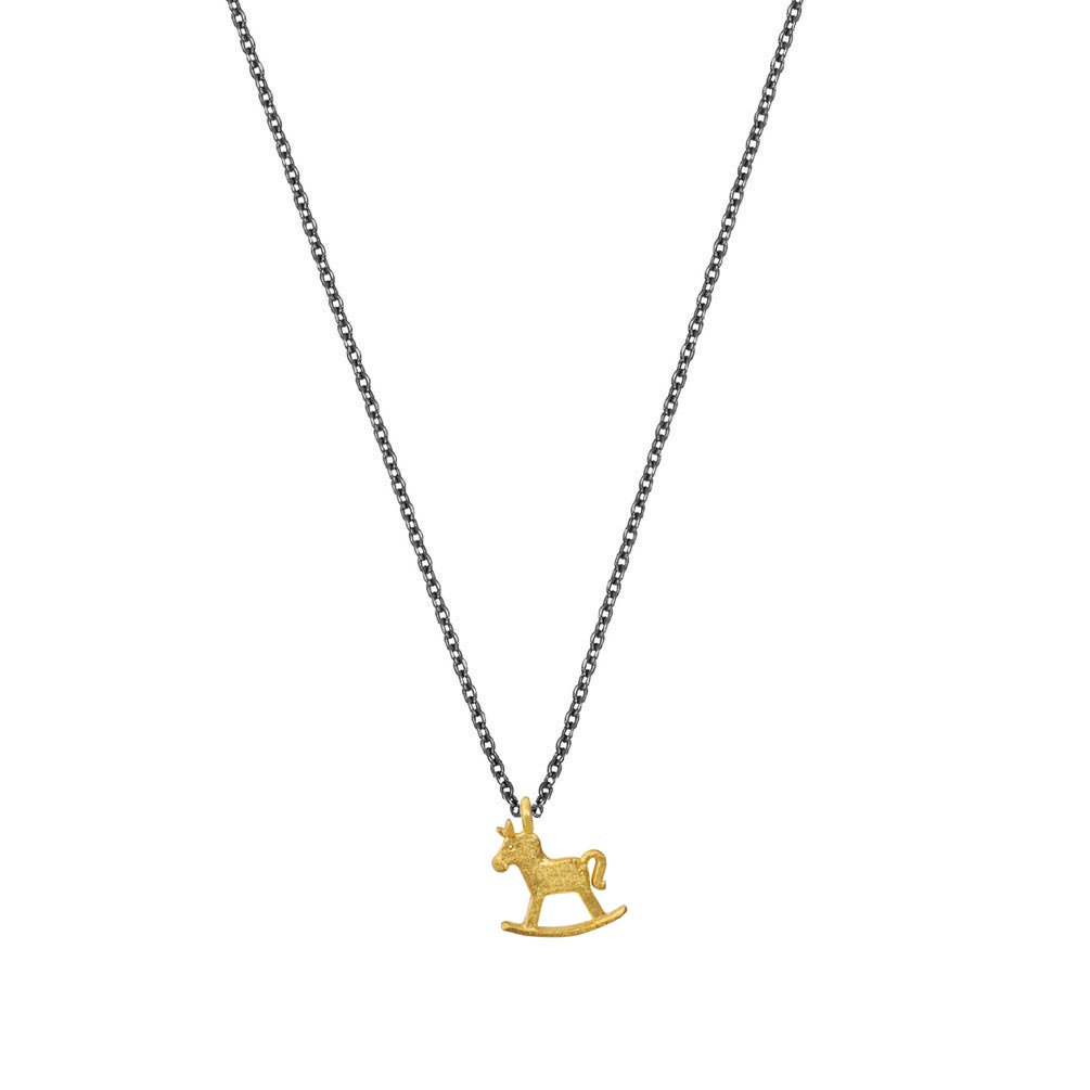 An diese verspielten Halskette aus geschwärztem Sterling Silber von Krinaki Jewelry baumelt ein bezauberndes, goldenes Schaukelpferd als Anhänger!
