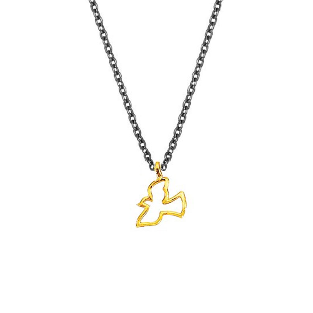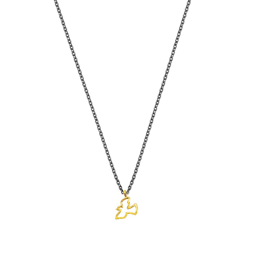 An dieser fabelhaften, filigranen Halskette von Krinaki Jewelry aus geschwärztem Silber fliegt eine bezaubernde kleine Taube aus Gold!
