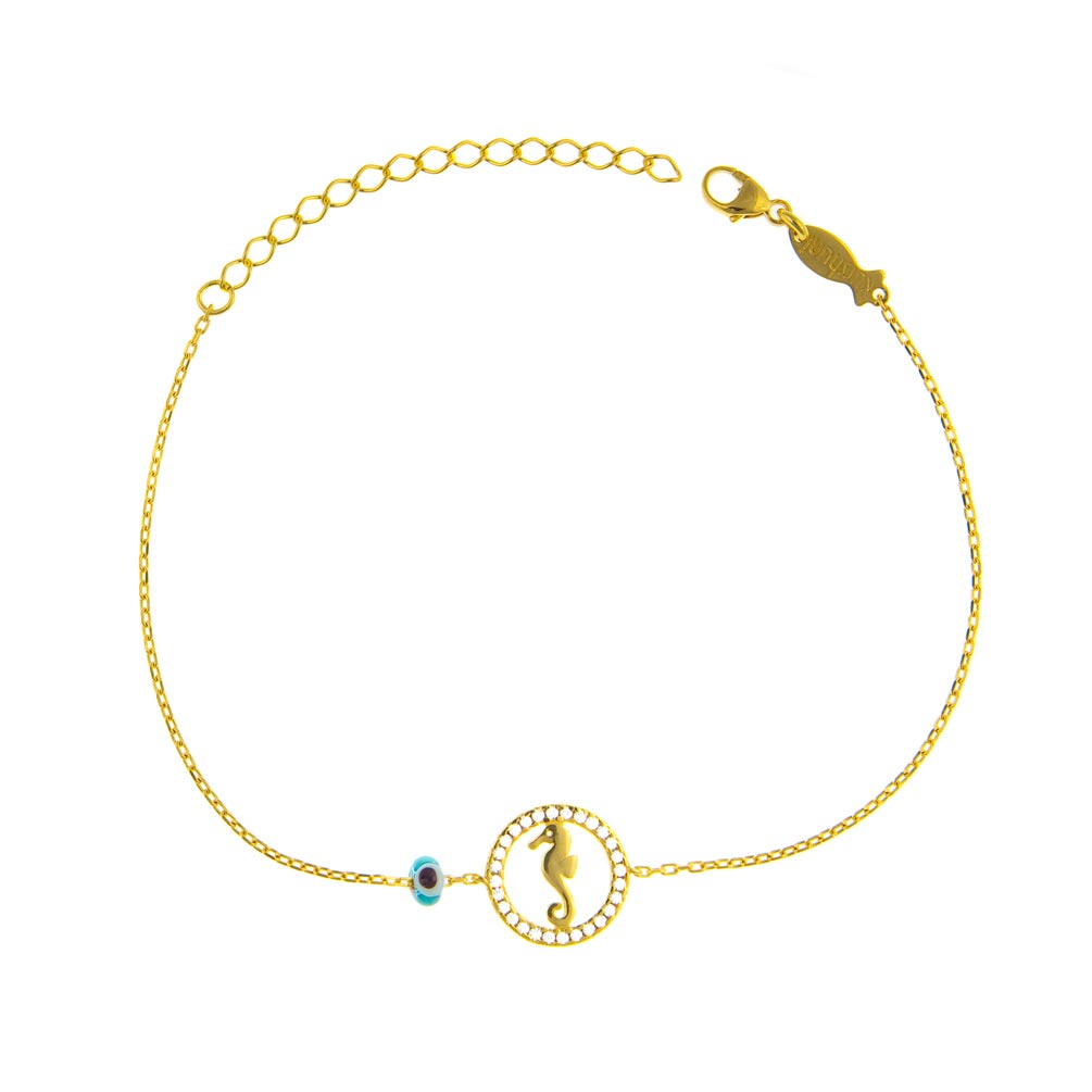 Entzückendes, goldenes Armband von Kurshuni mit bezauberndem Seepferdchen in einem Ring aus funkelnden Zirkonias!