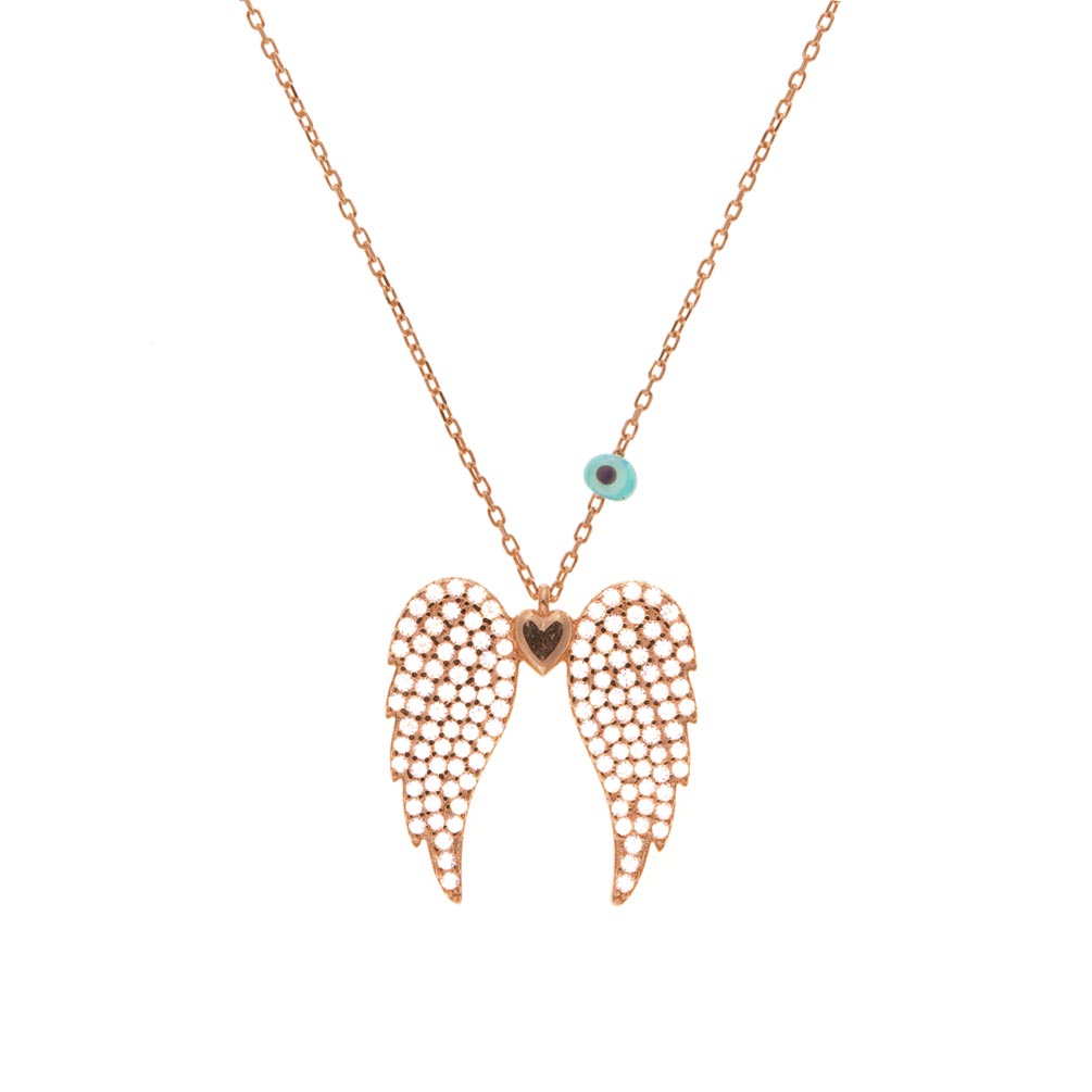 Herrliche Kurshuni Halskette aus rosévergoldetem Sterling Silber mit wunderschönen Engelsflügeln, besetzt mit funkelnden Zirkonias, und viel Herz!