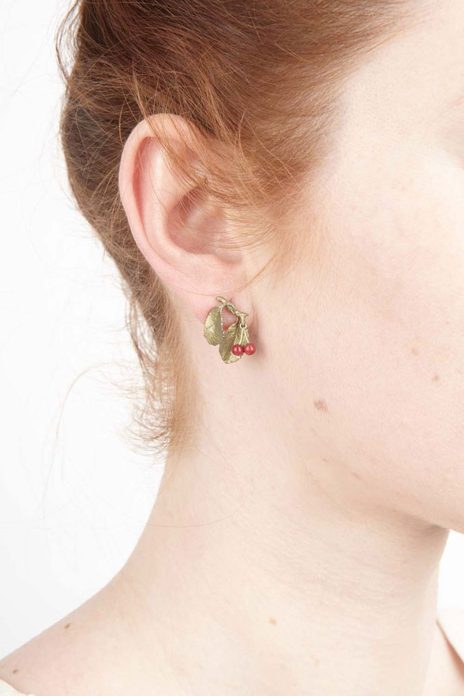 Zauberhafte Michael Michaud Ohrringe mit hinreißenden Kirschen aus roter Jade und verspielten Blättern aus handpatinierter Bronze!